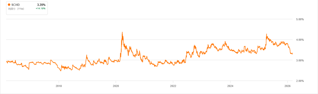 日本では本家SCHDを購入することができないことや配当利回りが落ちることから、2026年3月現在では買わない方針です。