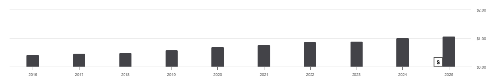 他の米国高配当ETFは0.3%が多いので、経費率によって配当利回りが大幅に低下することはありません。
