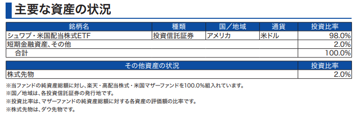 と楽天証券は言っているので、SCHDに100%投資しているように見えて、実際は98%分しか投資できておらず、資金効率が悪くなっているという現象が起きています。