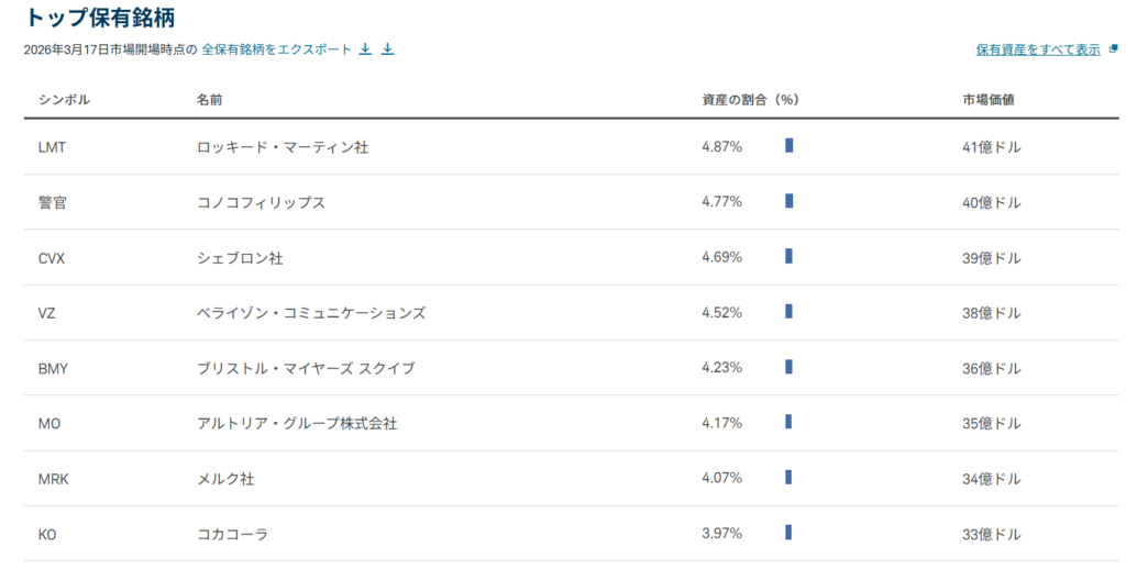時価総額が大きい銘柄ほどSCHDに占める投資比率が多くなります。