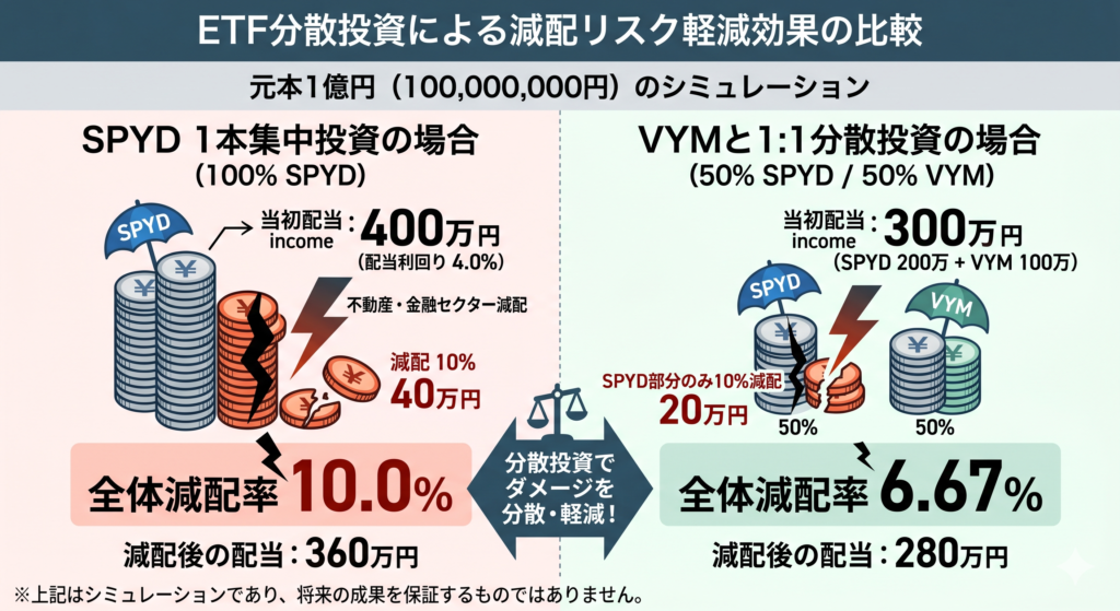 VYMを混ぜることで、SPYDが10%下落しても、配当金全体の減配率が6%台になるので、ダメージがマイルドになります。