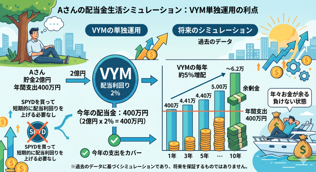 貯金2億円で、毎年400万円の支出をするAさんがいるとします。貯金2億円を使って、配当利回り2%でVYMを購入しても、今年は400万円の配当金が得られるので、SPYDを買って短期的に配当利回りを上げる必要がありません。VYMは毎年約5%増配するので、購入後は年々お金が余っていく状態になります。