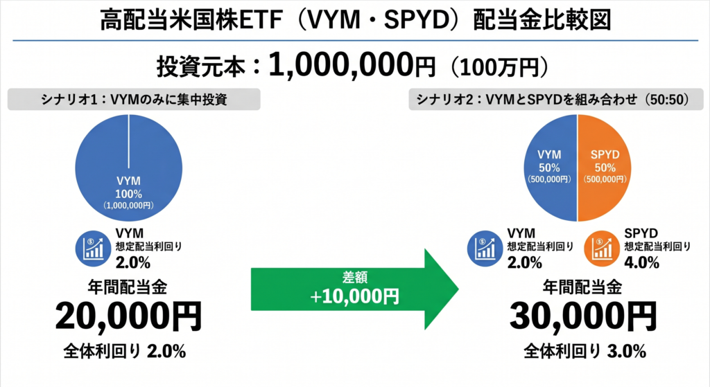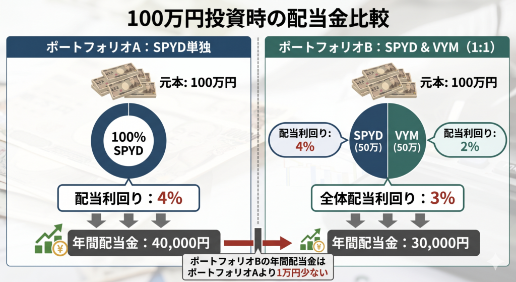 短期的に見れば、VYMに集中投資するよりも、SPYDの投資比率を高めた方が配当金が多くなります。