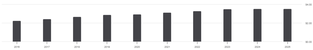 購入時点で配当利回り4%を超えることは難しいですが、驚異的な増配率で、たった数年でSPYDの配当利回りを超えます。