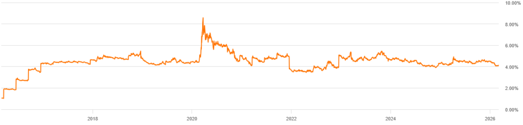 上記グラフは、SPYD設定日以後の配当利回り推移です。