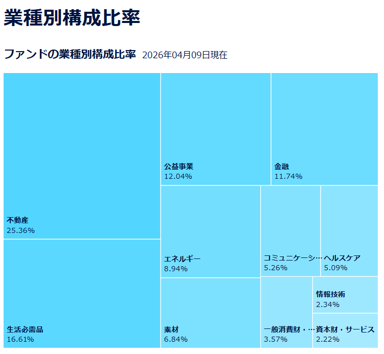 分散を広げたい不動産・金融セクターのような景気敏感株を強化したいVYM等には少ない「不動産」や「金融」が大きな比率を占め、ポートフォリオの補完になるため。