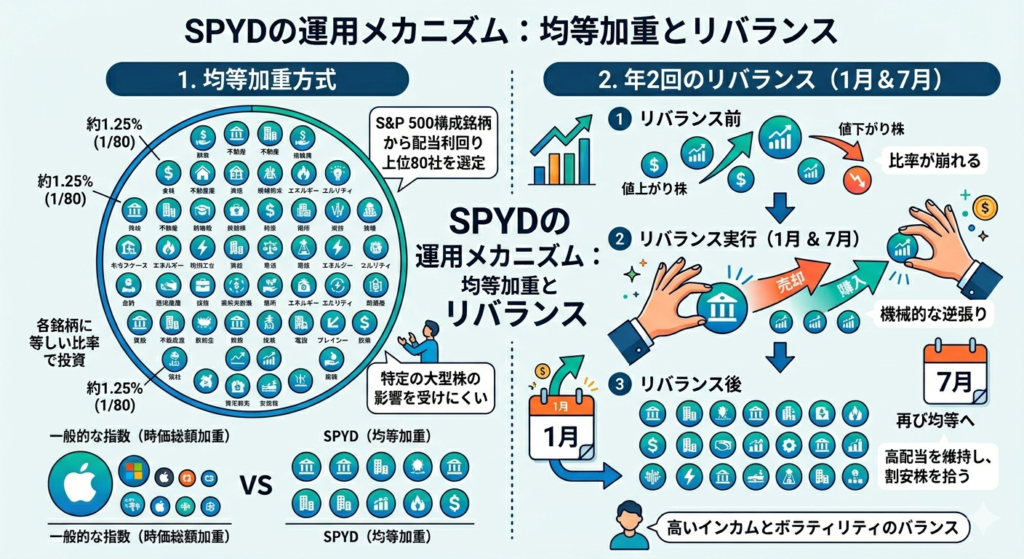 SPYDは銘柄ごとの時価総額にかかわらず、1銘柄あたり1.25%ずつ均等な比率で投資を行う均等加重方式を採用しています。