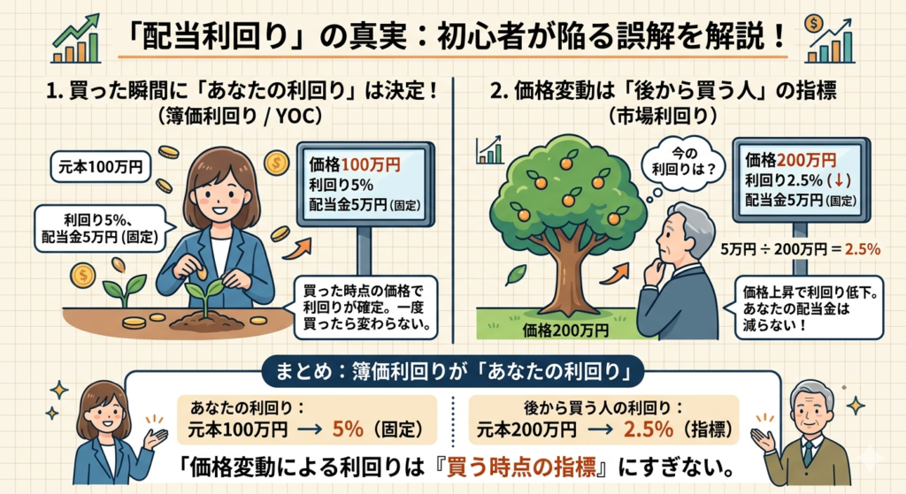 しかし、あなたが買った元本100万円に対する配当金の金額(5万円)は変わらないので、価格が変動したとしても配当利回りは5%のまま変わりません。