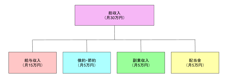 図のように、各収入源の柱を増やして、強化していくことで月の総収入が増えます。このブログでは、結果的に月3万円の配当金(分配金)の獲得を目指していきます。